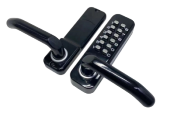 Levered Handle Mechanical and Key less Push Button Door Local is a Black Color with Silver Highlights.